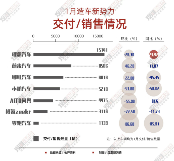 第二梯队唯一上市的零跑汽车,1月只交付了1139辆,环比跌幅高达87%。