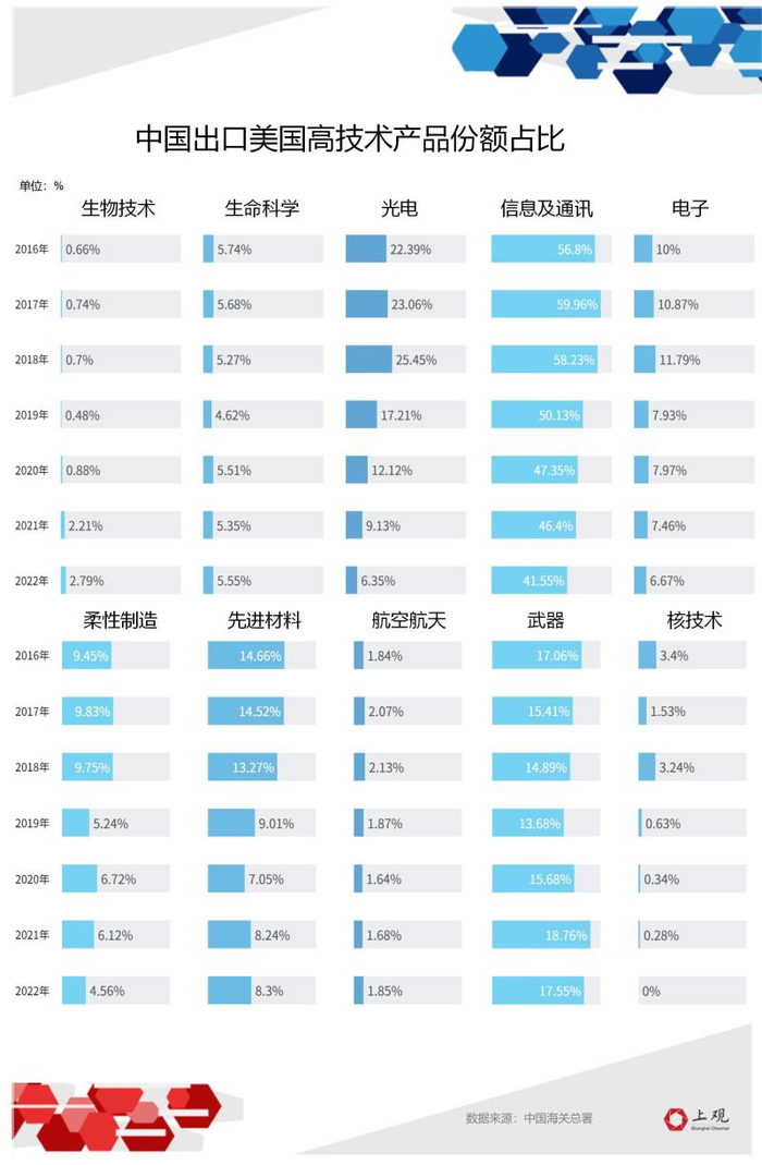 而在中国对美依赖度较高的领域,美国也试图减少对中国出口的比重。