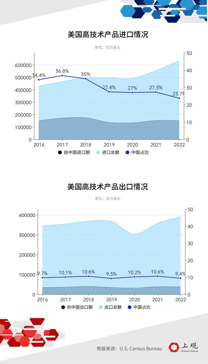 据美国商务部统计,2022年美国高技术产品的进出口额都有所增加,但与中国相关的占比都有所减少。2022年,美国自中国大陆进口的高技术产品同比减少0.4%,仅占其进口总额的23.7%;而美国对中国大陆出口的高技术产品也减少了300多亿元,同比减少2.4%。