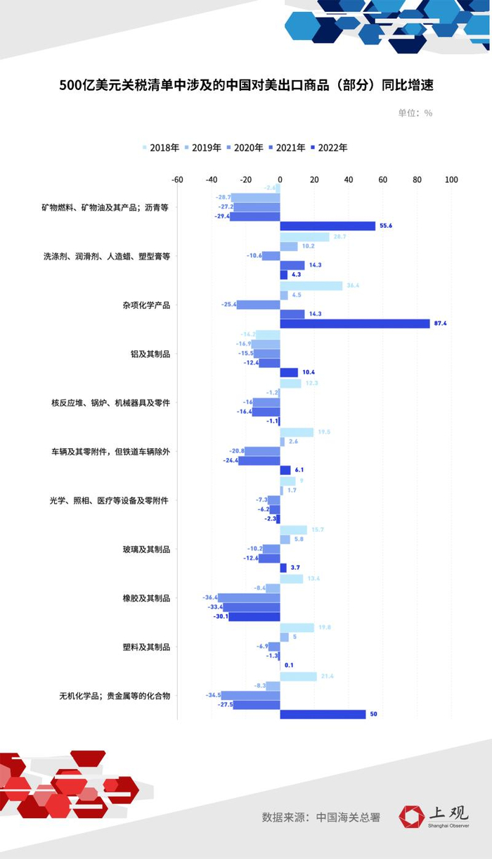 海关数据显示,受此政策影响,中国矿物燃料、无机化学品、杂项化学品、铝及其制品对美出口在2022年均实现了较大幅度的同比增幅。