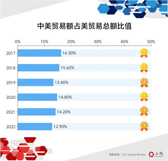 2018年,中国占美贸易总额为15.6%,到2022年下降至13.0%。作为曾经最大的贸易伙伴,贸易战后中国多次降为美国第三贸易国,尽管2020年由于美国出口增加,中国重回榜首,但2021、2022年已连续两年位列加拿大、墨西哥后。