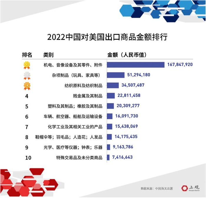 其中,机电产品占绝对优势,2022年占出美总额的43.36%,相关出口额增幅4.49%,但较去年同期有所下降。