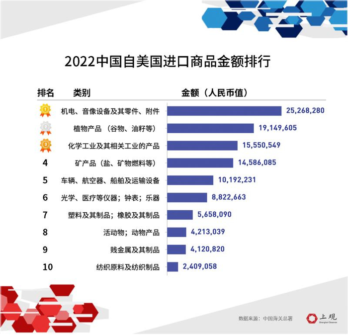 从中国的进口来看,除了机电产品外,自美国进口品类则以初级产品为主,包括谷物在内的植物产品进口金额持续稳定增长,与大豆等农产品相关及与矿产相关的重点领域进口依赖度较高。据美国农业部数据显示,2021/22年度中国大豆进口量为9157万吨,中国仍是美国大豆的最大买家,需求占比居于首位。
