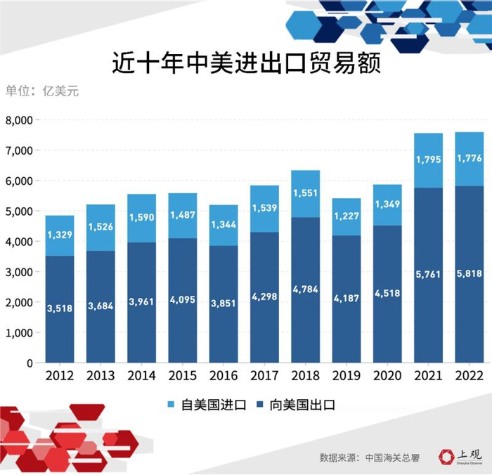 中美贸易金额又创新高!据美国商务部2月7日发布的报告,2022年,美国和中国货物贸易总额达6906亿美元,创下历史新高。其中,中国向美国出口总额达到5817.83亿美元,中国自美国进口1776.44亿美元。那么,中美贸易数据中有哪些值得关注的细节?