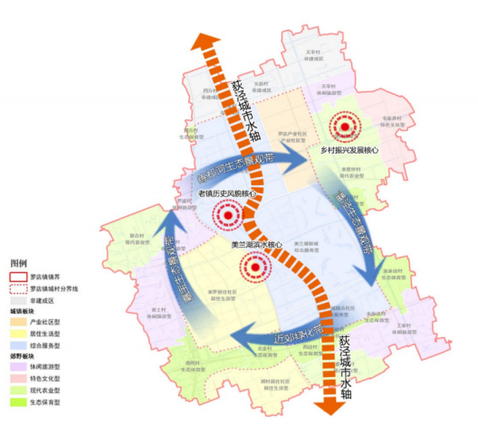 罗店镇将生态清洁小流域治理放在河湖长制推行和美丽乡村建设大局中谋划,结合上海市生态清洁小流域的河湖水系治理、面源污染治理、水土流失综合治理、生态修复和人居环境改善五类治理角度出发,以系统化共治、长效化管护,探索打造生态清洁小流域治理管护的新模式,全面改善了水生态环境。罗店镇的生态清洁小流域建设总体布局为“一轴、一环、三心”。“一轴”指一条南北向贯穿罗店老镇-新镇的荻泾城市水轴;“一环”指由城市板块的嘉宝生态景观带、练祁河生态景观带、潘泾生态景观带,以及郊野板块的近郊绿化组成的生态廊道环线;“三心”指乡村振兴发展核心、美兰湖滨水核心、老镇历史风貌核心。