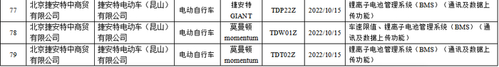 由捷安特电动车(昆山)有限公司生产、北京捷安特中商贸有限公司销售的2批次电动自行车锂离子电池管理系统(BMS)(通讯及数据上传功能)不合格,品牌分别为捷安特GIANT和莫曼顿momentum,生产日期/批号均为2022/10/15,其中1批次规格型号TDP22Z,1批次规格型号TDT02Z;1批次电动自行车车速限值、锂离子电池管理系统(BMS)(通讯及数据上传功能)不合格,品牌为莫曼顿momentum,规格型号TDW01Z,生产日期/批号为2022/10/15。