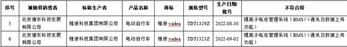 本次抽查发现,北京豫东科技发展有限公司销售、雅迪科技集团有限公司生产的2批次电动自行车锂离子电池管理系统(BMS)(通讯及数据上传功能)不合格,其中1批次规格型号TDT1329Z,生产日期/批号20220830,1批次规格型号TDT1323Z,生产日期/批号20220902。