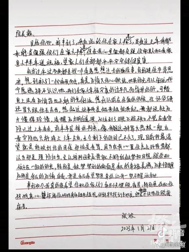 陈美霖在个人社交账号称,张波分别于今年1月1日、1月14日、1月27日给她写三封信表达忏悔,并请求她原谅。