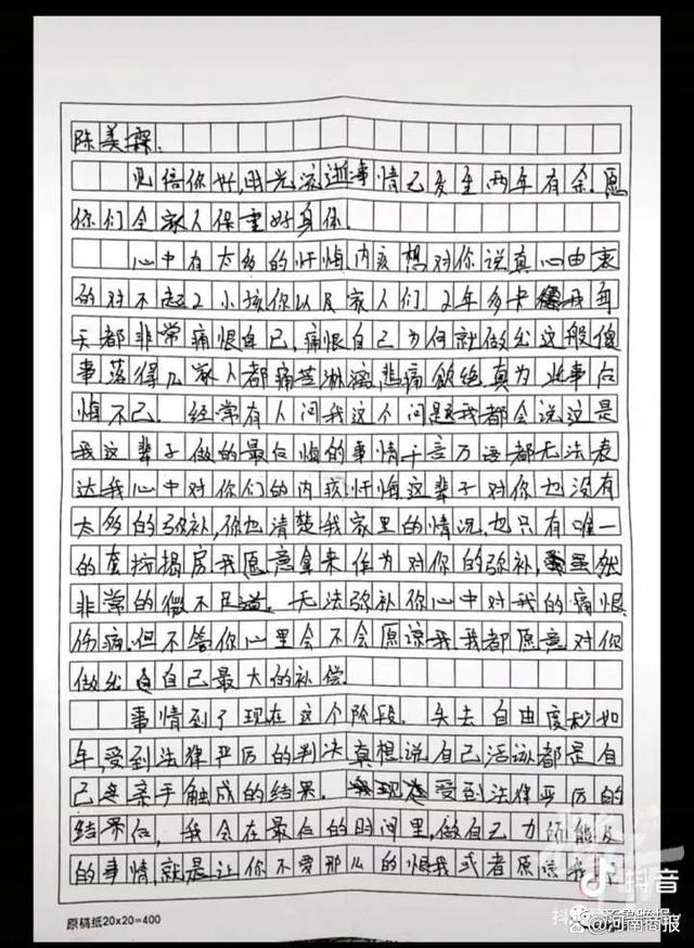 对于张波发来的忏悔信,陈美霖及其家人均表示不认可,“事情发生这么久了才来忏悔,早前的时候难道就没忏悔么?二审开庭在即,他们是想保命或其他目的。”