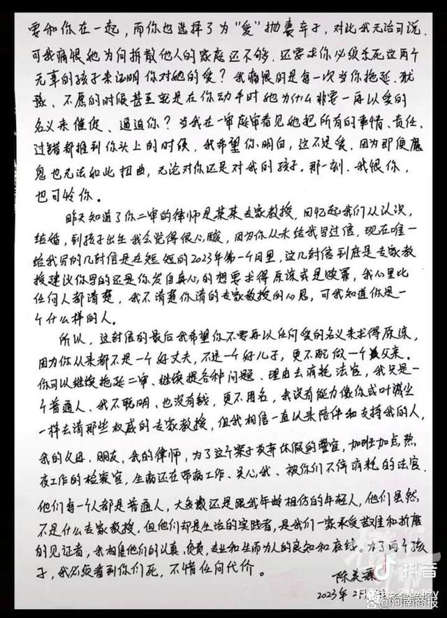 在信的最后,陈美霖写道:“我希望你不要再以任何爱的名义来求得原谅,因为你从来都不是一个好丈夫,不是一个好儿子,更不配做一个父亲……为了两个孩子,我必须看到你们死,不惜任何代价。”