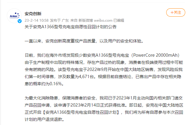 2月14日起,安克创新在中国大陆地区正式开启“安克A1366型号充电宝自愿性召回计划”,将为所有自愿参与本次召回计划的用户退货退款。