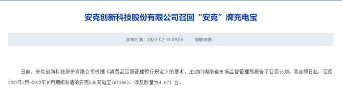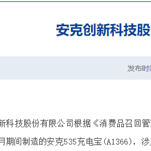 2月14日,据湖南省市场监督管理局消息,安克创新科技股份有限公司(股票代码300866.SZ,以下简称“安克创新”)将召回“安克”牌充电宝。