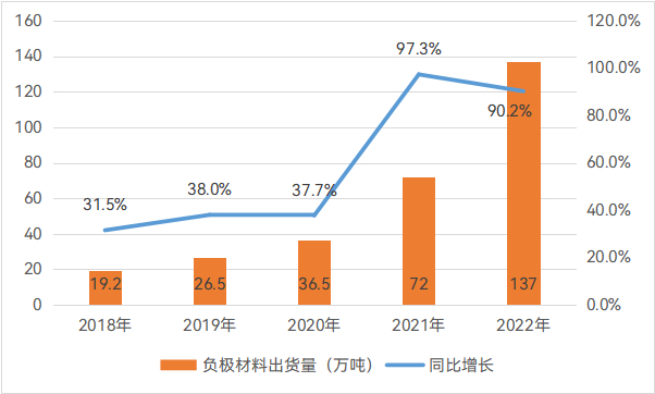 中国负极材料的出货量从2017年的14.6万吨迅速提升至2021年的72万吨,CAGR(复合年均增长率)高达49%,2021年当年的同比增长则高达97.3% [3][7]。2022年负极材料出货量137万吨,同比增长90.3%,增速略微放缓 [8]。