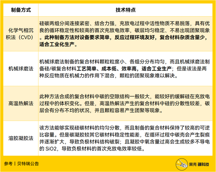 相对石墨负极材料,硅基负极的制备工艺复杂,各家生产流程不同,没有统一的产品标准。目前,常见制备方法有化学气相沉积法、机械球磨法、高温热解法、溶胶凝胶法 [16]。其中机械球磨和化学气相沉积法对设备要求较为简单,制造成本较低,因此普及程度较高,但在工业上为了保障产品性能,多种工艺搭配使用同样普遍。