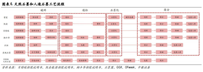 从生产端看,石墨负极的生产流程长,工序多,且不同企业的生产流程存在一定差异。人造石墨生产流程主要分为破碎、造粒、石墨化和筛分四大环节,以及细分的十余个工序,不同企业在不同环节上的使用的生产工艺均有一定区别,而这些不同均会影响产品的最终性能。