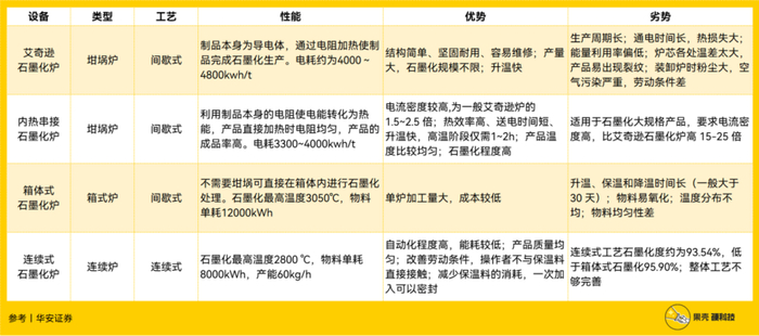 以加工设备区分,石墨化可分为坩埚炉,包括艾奇逊炉和内热串接炉两种,箱式炉以及连续炉。坩埚炉与箱式炉均属间歇式工艺,连续炉则名副其实 [6]。
