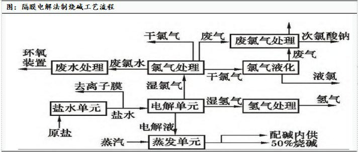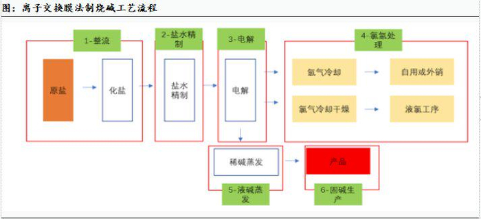 目前,离子交换膜电解法制烧碱工艺成熟,为主流生产方法。离子交换膜法,是用有选择性的离子交换膜来分割阳极和阴极。这种离子交换膜是一种半透膜,只允许钠离子和水通过。中国烧碱工业主要采用离子交换膜法,其工艺流程主要分为:整流、盐水精制、电解、氯氢处理、液碱蒸发、固碱生产六个工序。与隔膜法相比, 离子膜法对环境污染小、投资少、单位能耗更低。离子膜电解槽具有更强的选择性, 能够得到高纯度的电解液。不但降低了直流电耗,而且使电解液蒸发过程中的蒸汽消耗量大幅降低。且离子膜法蒸发步骤简便,成品中氢氧化钠含量高,氯化钠杂质含量低,仅为0.007%。
