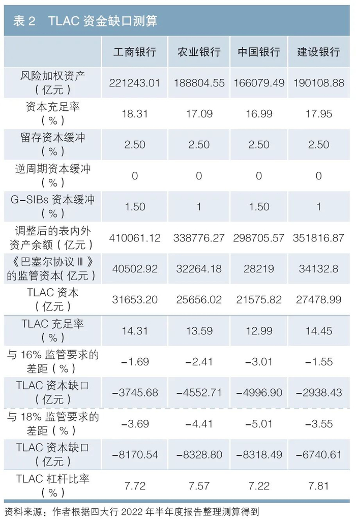 笔者基于四大行2022年半年报数据进行静态测算(见表2),按照2025年初16%的实际资本充足率监管标准,我国4家G-SIBs面临的TLAC资金缺口约为16234亿元,平均每年需补充资金8117亿元;按照2028年初18%的实际资本充足率监管标准,我国4家G-SIBs面临的TLAC资金缺口约为31558亿元,除去2023年、2024年已弥补的缺口,平均每年还需补充资金5108亿元。从资金缺口来看,我国G-SIBs如期实现TLAC监管达标面临不小的挑战。