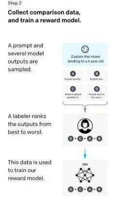 “标注工”对这些答案的质量进行排序:C>A>B,这些排序最终形成一个对答案优劣打分的奖励模型(RM),让系统越来越能预测人类的表达方式。