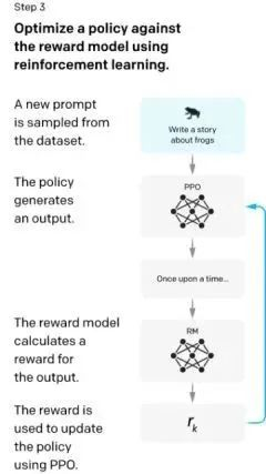 大致过程是,先用第一步的策略(SFT)随机生成一个新的文本,放到第二步的奖励模型(RM)里打分,根据分数再回头训练生成新的表达策略(SFT),再调整第二步的奖励模型(RM)的函数,反复迭代,生成最终的模型。