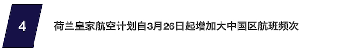 荷兰皇家航空公司宣布,自3月26日夏季航班时刻生效起,计划增加飞往大中国区的航班频次,以响应中国相关主管部门取消旅行限制。荷航每周将执飞3个从阿姆斯特丹飞往中国香港的航班,并将开始运营每周6个不经停直飞航班飞往北京和上海的航班,从5月起计划增加到每日1班。北京也由此回归荷航航线网络。从3月26日起增加航班频次,标志着阿姆斯特丹-大中国区航线的进一步恢复。