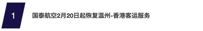 2月20日起,国泰航空将恢复每周三班往来温州与香港的客运航班服务,这将是国泰航空恢复的第十四条内地航线。重新启航的温州与香港客运服务将于每周一、四、五营运,采用空客A321neo客机执飞。A321neo为国泰航空单通道机队的新成员,配有专为短途航线而设计的崭新公务舱及经济舱座椅,所有客舱亦都配备4K超高清个人电视屏幕,为旅客带来焕然一新的飞行享受。目前,旅客搭乘国泰航空前往香港,持有出发前48小时核酸检测阴性证明,并填写相关健康申报,即可享顺畅的“通关”流程。