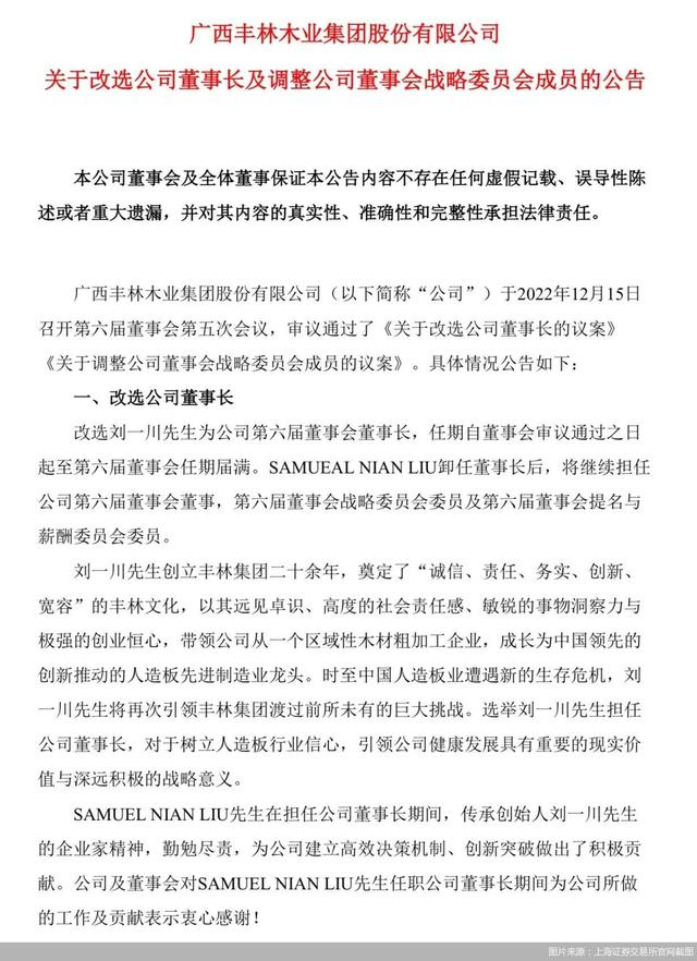 2023年兔年伊始,广西丰林木业集团股份有限公司(以下简称“丰林集团”,股票代码:601996)一则宣布创始人刘一川重新担当法定代表人兼董事长、儿子刘念只担任一些闲职的公告,引发人们诸多猜想。