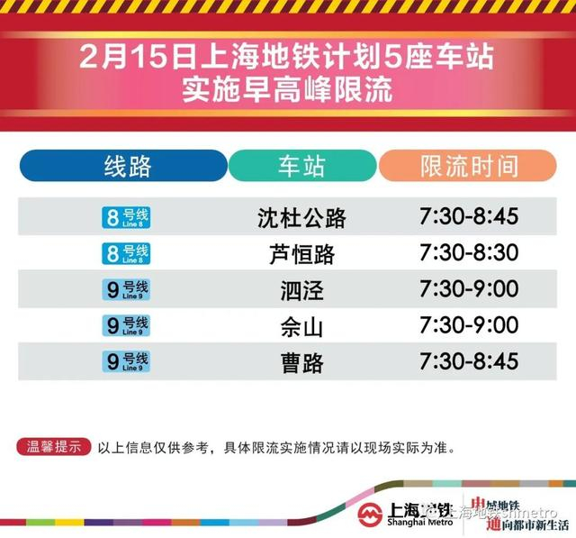 2月15日,上海地铁早高峰限流措施将继续实施,届时将有5座地铁站早高峰计划限流。