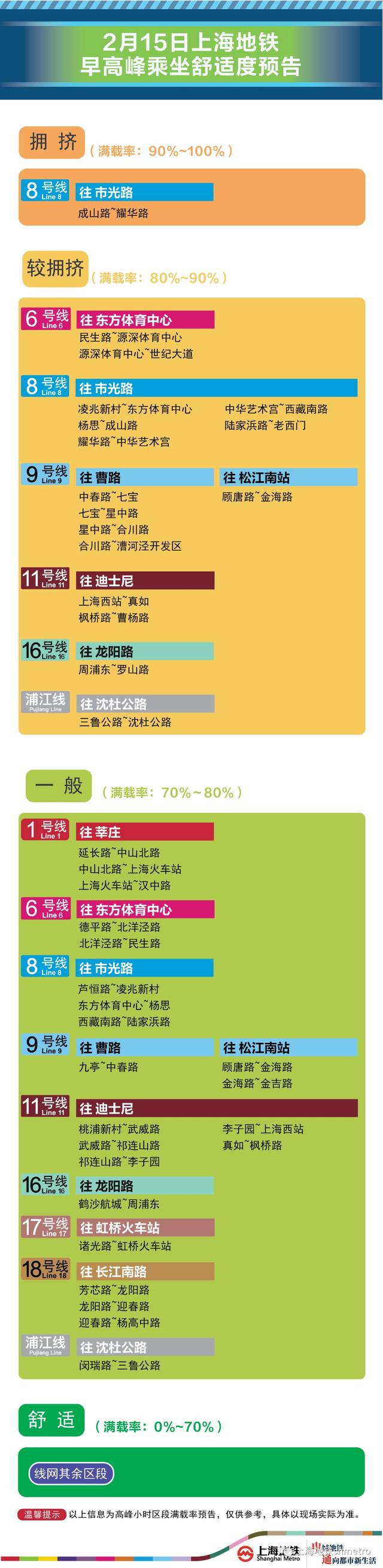 为提升上海地铁早高峰期间出行服务水平,提升乘客乘坐体验,上海地铁向乘客提供乘坐舒适度预告,方便乘客提前做好出行准备。