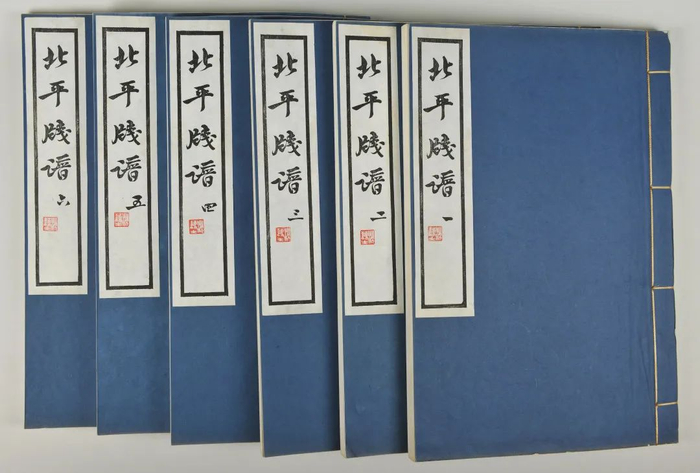 《北平笺谱》,鲁迅、西谛(郑振铎)编。共收木刻套印彩笺310幅,瓷青纸书衣,线装,六册一函。鲁迅装帧设计。民国二十二年(1933)北平荣宝斋彩色套印本。