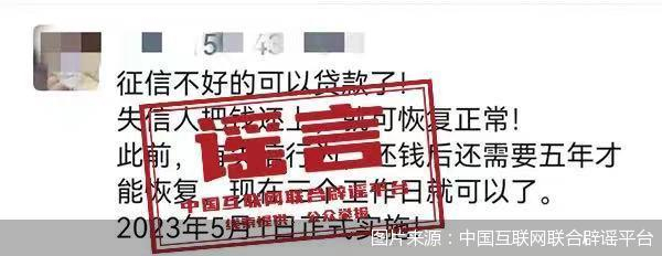 信息显示,这一谣言的传播者认定个人征信自5月1日后可以修复,主要依据为国家发改委1月17日发布的《失信行为纠正后的信用信息修复管理办法(试行)》(以下简称《办法》)。《办法》自5月1日开始实施,同时,在信用信息修复方面,《办法》要求信用平台网站应当在作出信用信息修复决定之日起三个工作日内将修复信息共享至认定单位和相关系统。