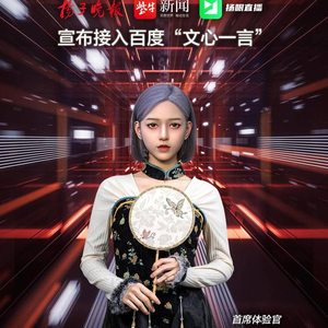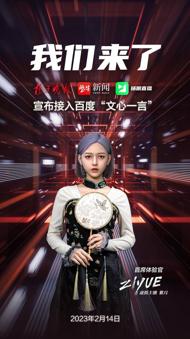 2月 14日, 虚拟主播“紫月”作为扬子晚报旗下紫牛新闻、扬眼直播等融媒矩阵的代表,成为百度文心一言的融媒体验官(英文名:ERNIE Bot)。扬子晚报作为首批先行体验的媒体之一,全面接入文心一言的产品能力,将百度领先的智能对话技术成果应用在智能内容生产领域。