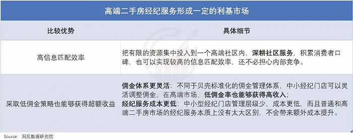 换句话说,就是形成了一定的利基市场。比如,专注服务于高端二手房细分市场的中小经纪门店,往往可以实现更高的信息匹配效率;同时采取低佣金策略,也能够收获超额收益。