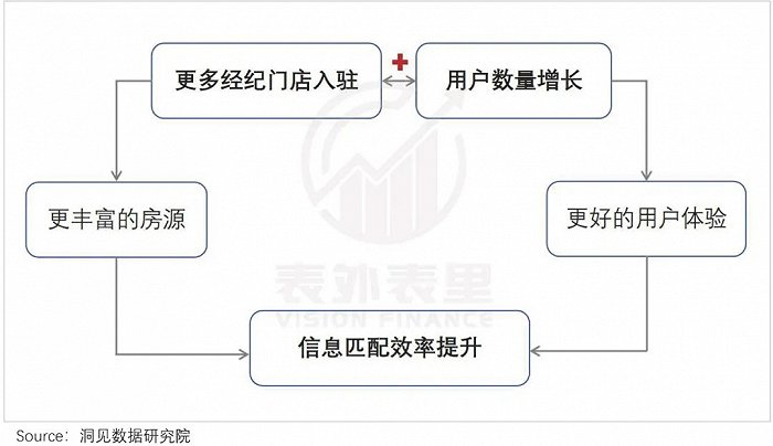 简单来说就是,平台的房源越多,平台对用户的价值越大、越有吸引力。更多的用户,又会促使更多的房源推出,如此循环形成“双边网络效应”,带来规模增长。
