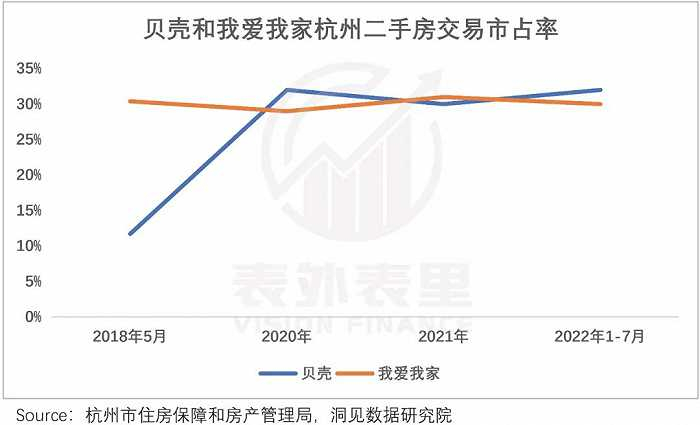 具体来说,2018年平台化后,通过吸纳加盟模式,贝壳的份额迅速拉升。2020年在杭州的市占率,就超过了我爱我家。