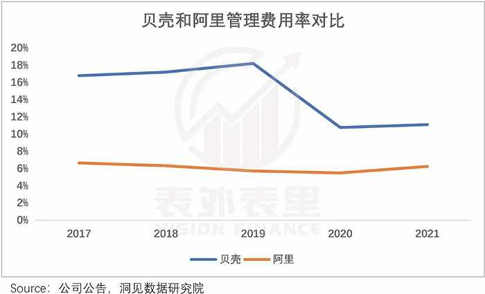 事实上,2018年开启平台模式以来,因加盟制组织成本低于直营制,贝壳管理费用率显著下降——10%左右。当然,相比阿里的6%,仍有较大的差距。