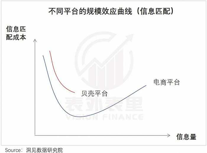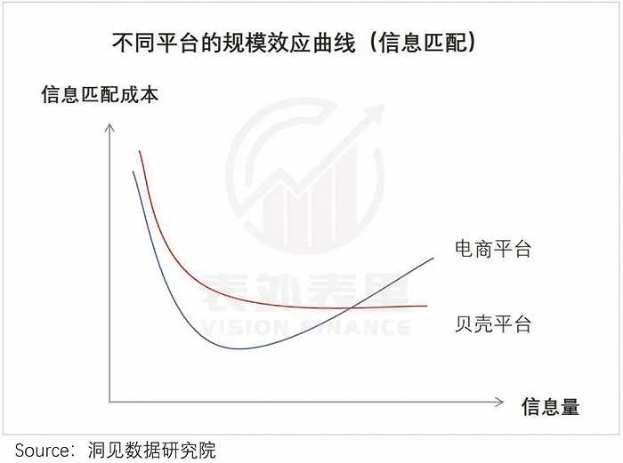 而门店竞争加剧,一定程度上会抵消信息匹配成本的下降,再叠加需求端有限的规模效应,贝壳在信息匹配上的规模效应,事实上呈现“先下降,后放缓”的特征。