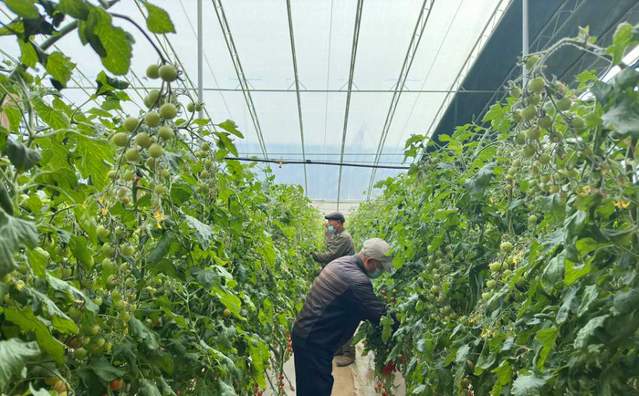 2月14日,菜农在白沟新城一家农业园的果蔬大棚查看西红柿长势情况。