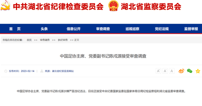 同日,湖北省纪委监委网站还通报,中国足球协会常务副秘书长兼国家队管理部部长陈永亮涉嫌严重违纪违法,目前正接受中央纪委国家监委驻国家体育总局纪检监察组和湖北省监委审查调查。