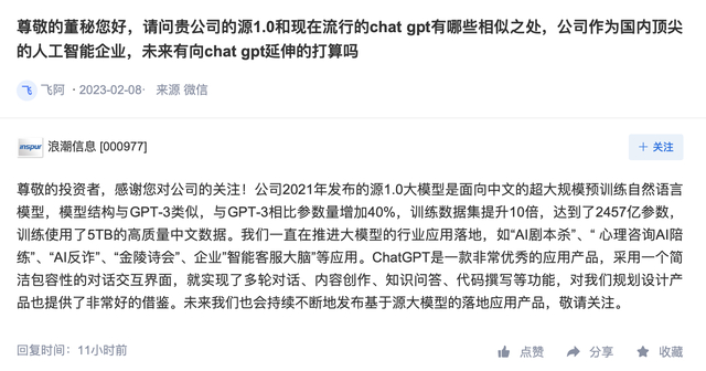 浪潮信息还表示,公司一直在推进大模型的行业应用落地,如“AI剧本杀”、“ 心理咨询AI陪练”、“AI反诈”、“金陵诗会”、企业”智能客服大脑”等应用。“ChatGPT是一款非常优秀的应用产品,对我们规划设计产品也提供了非常好的借鉴。未来我们也会持续不断地发布基于源大模型的落地应用产品。”