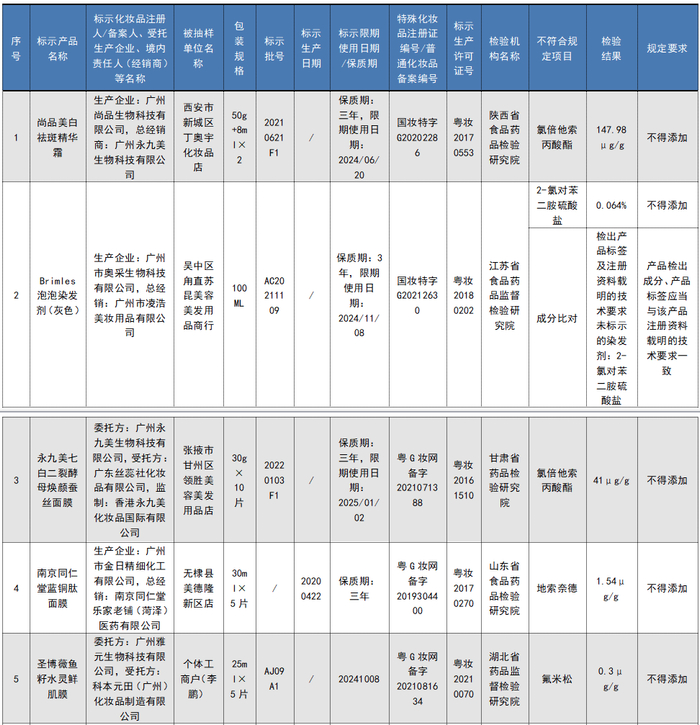 此外:标签标示名称为Brimles泡泡染发剂(灰色)的产品检出禁用原料的同时,还存在产品成分比对不符合规定的问题;