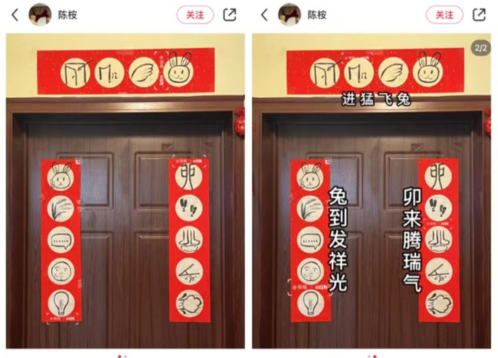 在小红书上,有网友晒出自家贴的春联,竟然全部用表情包写成,以兔子谐音“图”,以翅膀表示“飞”尚可联想,那水稻、灯泡、锐角又是什么意思?评论区里,有人“秒懂”,有人“完全不知道是啥”,还有人表示“春联融合了吉祥话和灯谜两项传统艺能”。