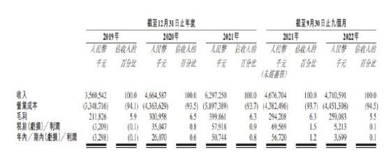 再来看盈利端,2019-2022年前9月,维天运通的毛利分别为2.12亿元、3.01亿元、4亿元、2.59亿元,对应毛利率5.9%、6.5%、6.3%、5.5%。同期,公司的净利润分别为-329.8万元、2607万元、5074.4万元、369.9万元,利润显得十分微薄。