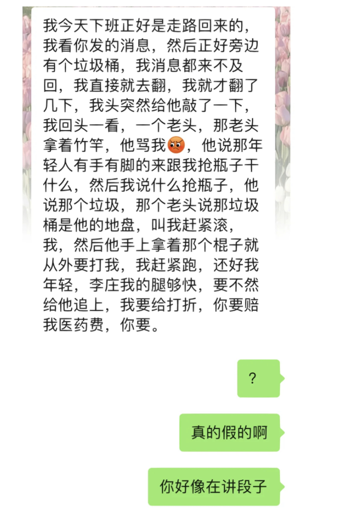 “情人节有人看海,有人被爱,有人却在垃圾桶里捡花。”