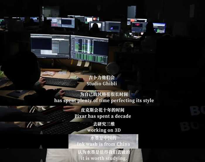 和电影同步上线的《深海》纪录片,揭示了田晓鹏与近1500人的团队一起耗时7年制作电影的历程。纪录片一开始就表达了影片创作的一个初衷,想要像吉卜力一样找到自己的风格,像皮克斯一样在三维制作上不断创新,在《深海》里去挖掘属于中国动画电影的水墨风格。