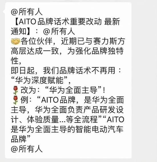 实现这样的掌控后,余承东和华为或许依然不满足。近日,一张截图在一些汽车销售群中流传,内容主要是疑似华为智选车方面已经与赛力斯方面达成一致,之后华为门店销售在介绍AITO品牌和问界系列车型时,用“华为全面主导”的话术替代此前的“华为深度赋能”。