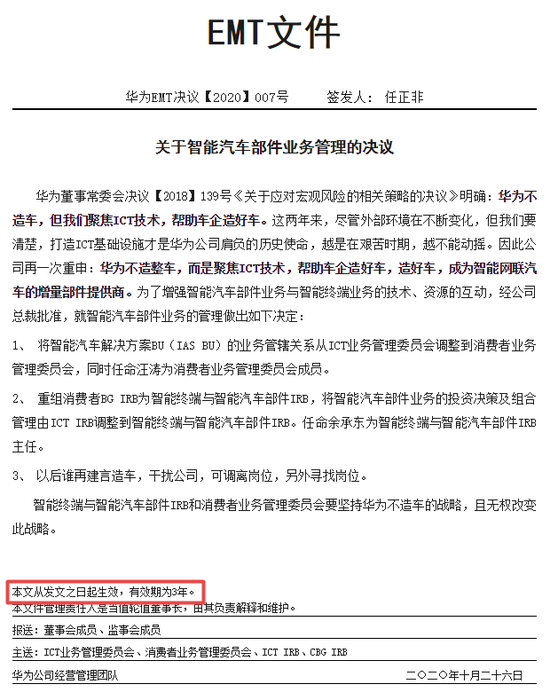 但需要注意的是,这份文件的末尾写着“本文从发文之日起生效,有效期为3年”。换句话说,距离“华为不造车”承诺失效的时间,按照时间推算就只剩8个月的时间了。