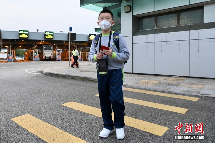 图为深港跨境小学生何其乐从文锦渡口岸过关抵达香港,准备前往久违的学校。