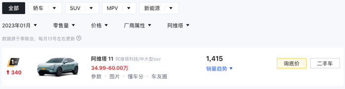 据乘联会最新数据显示,2023年1月,阿维塔11销量为1415辆。按照规划,今年年内阿维塔将推出阿维塔11单电机版,并发布第二款产品——全新中大型轿车,内部代号为E12,预计该车将在下半年亮相。