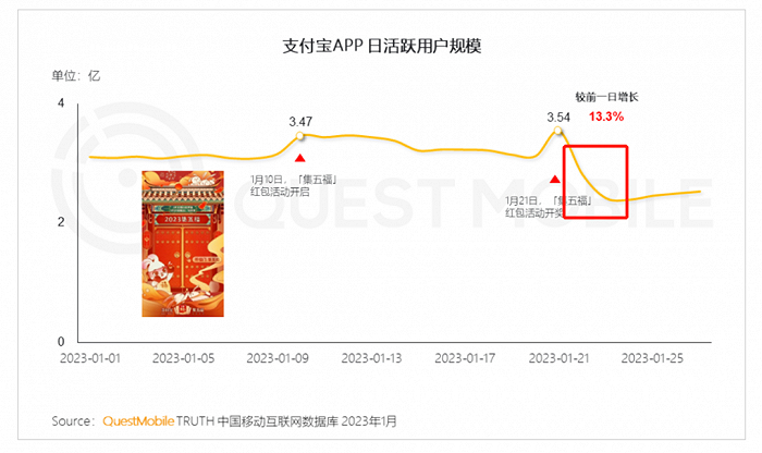 以QuestMobile最新的支付宝日活用户规模的曲线变化为例,在进入1月10日的五福活动开启时,日活用户达到一个高峰,在红包活动开奖后再次达到一个高峰,随后便快速下降为正常水平。
